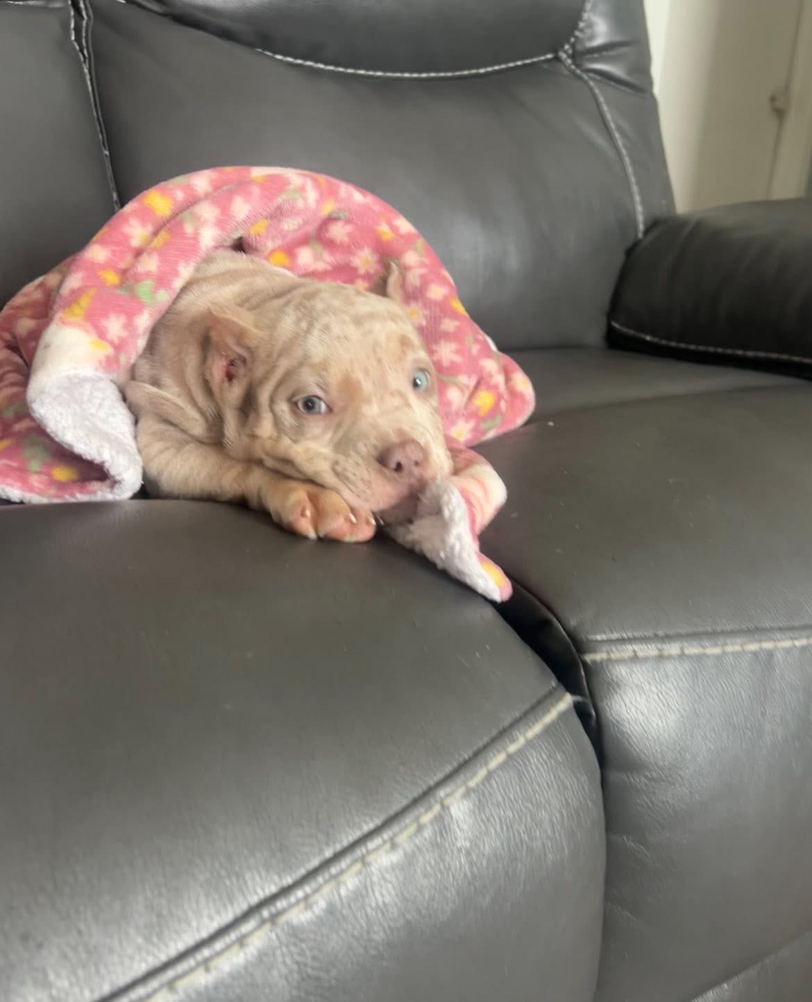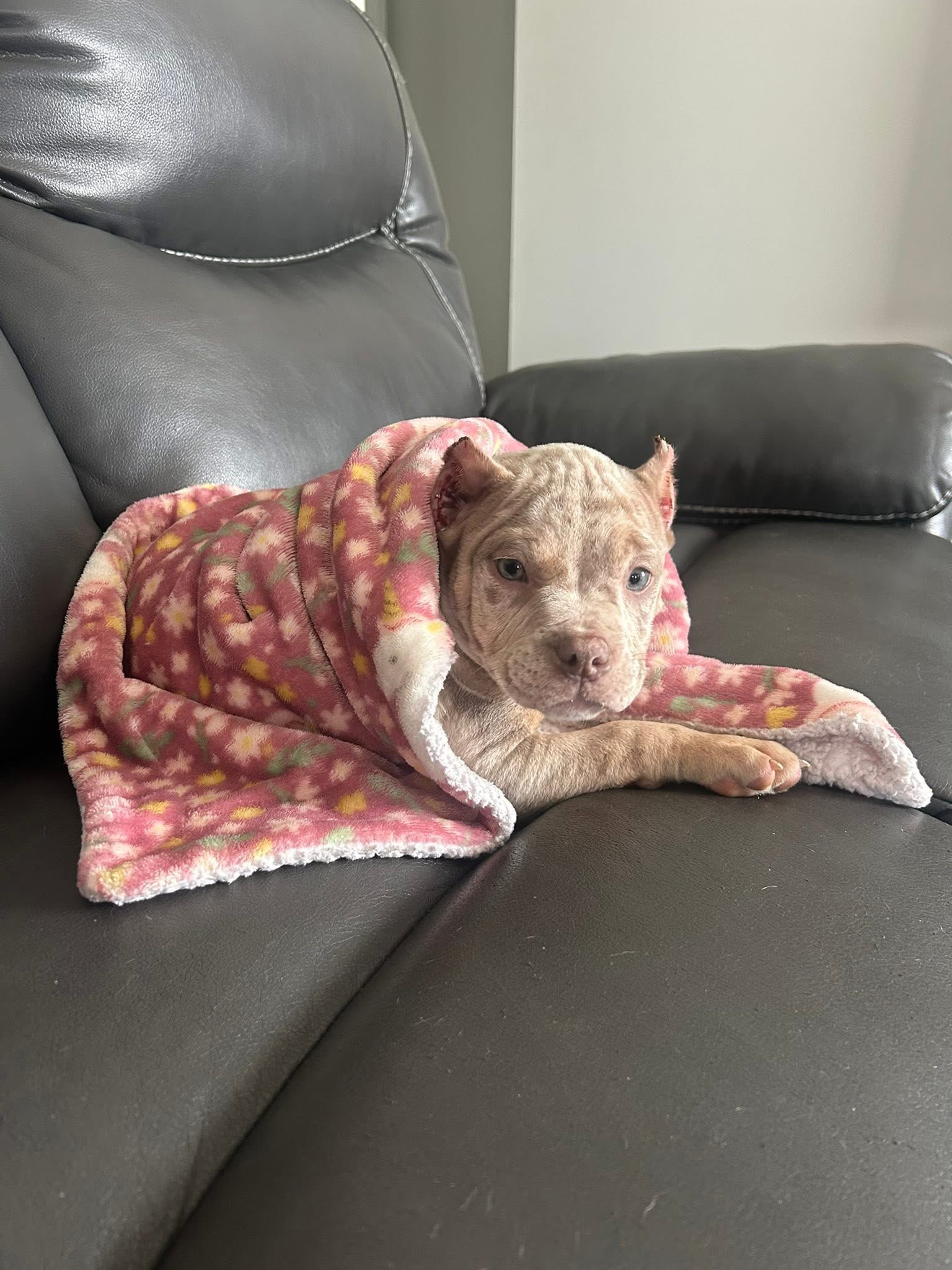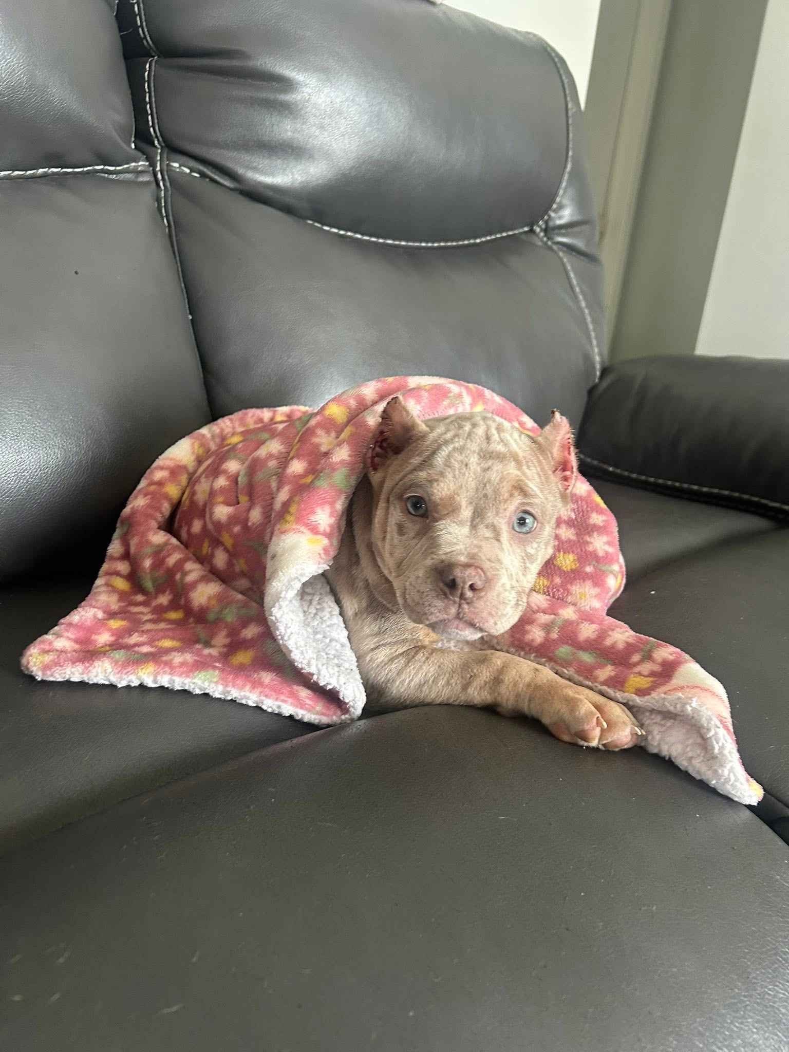 This little one is the definition of "cuddle bug meets powerhouse." Featuring a rare and highly sought-after lilac merle coat with stunning icy blue eyes, this puppy is a true show-stopper. Even at a young age, you can see the quality in the thick bone structure, broad chest, and beautiful "wrinkle" detail on the face. Tucked under a blanket in his favorite spot, he has a sweet, mellow temperament that would make him an incredible indoor companion. If you are looking for top-tier aesthetics combined with a compact, manageable size, this boy is a perfect choice.