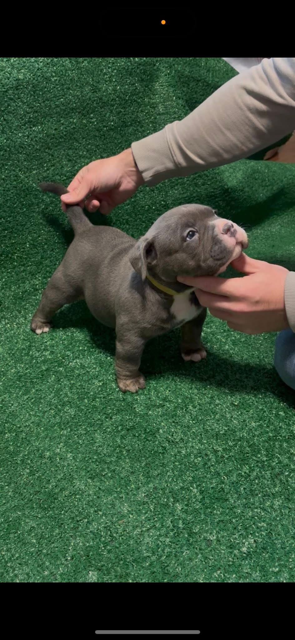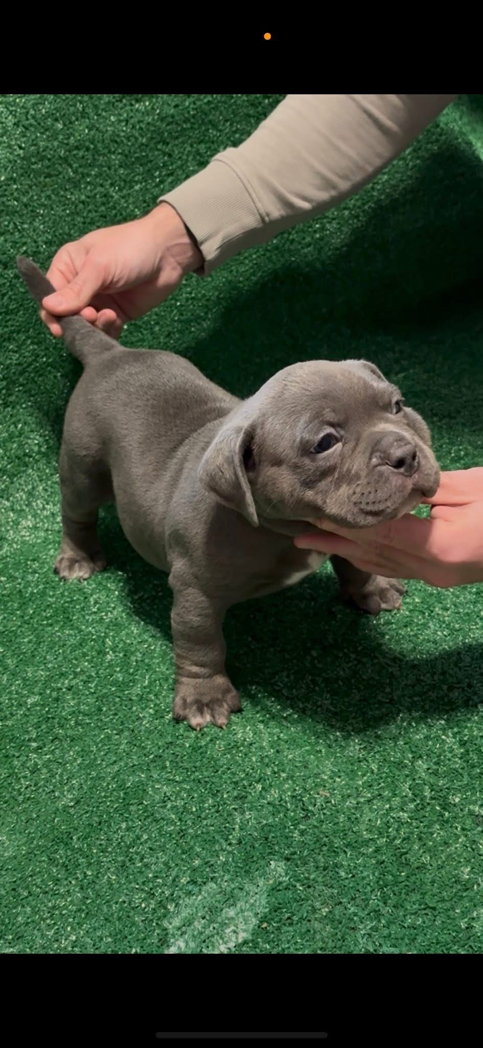 This puppy is a absolute powerhouse in a small package! Featuring a sleek, solid blue-gray coat and a classic "blocky" head, he is a perfect representation of the breed's sought-after compact build. Even at this young age, he shows impressive bone density, a broad chest, and a confident stance. He has been well-handled and shows a calm, attentive temperament, making him an ideal choice for a family looking for a loyal companion with a high-end, muscular look.