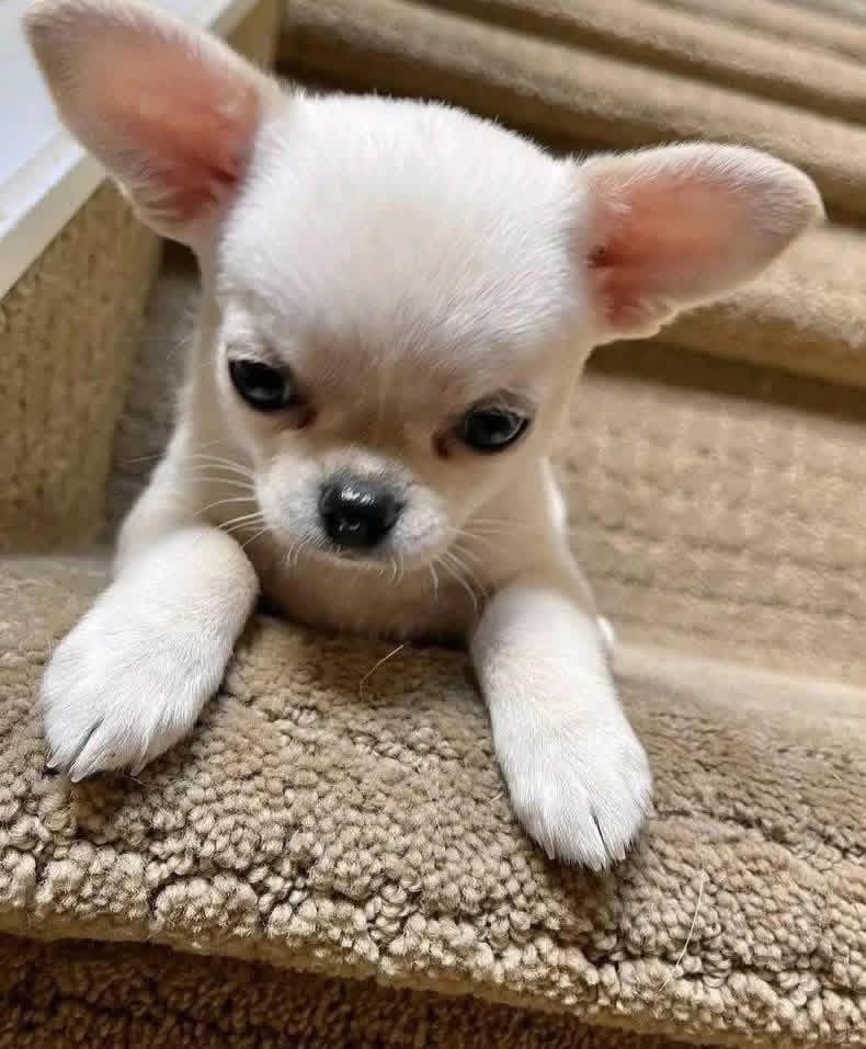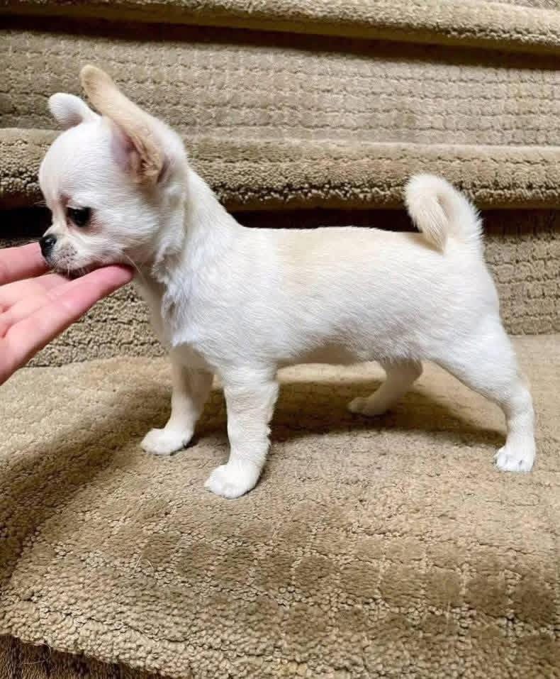 Meet your new best friend! This stunning short-haired Chihuahua puppy is a true head-turner with a beautiful pearl-white coat and deep, expressive eyes. With a perfectly shaped apple head and alert, oversized ears, this little one looks like a tiny fox. This puppy is the perfect blend of sweet and spunky. Short-haired Chihuahuas are famously easy to groom and love nothing more than burrowing under a warm blanket next to their favorite person. If you are looking for a loyal, pint-sized companion with a huge heart, this is the one for you