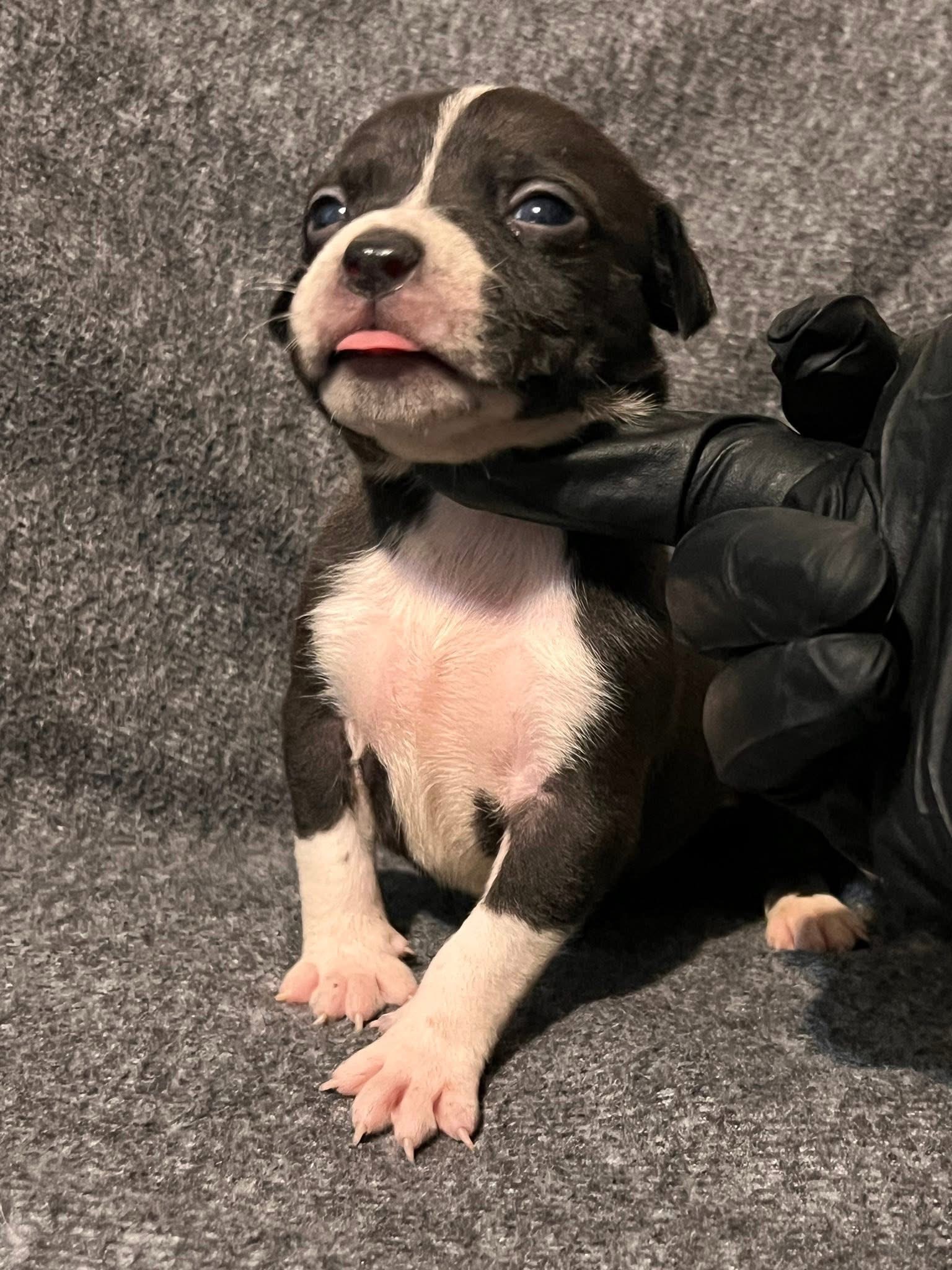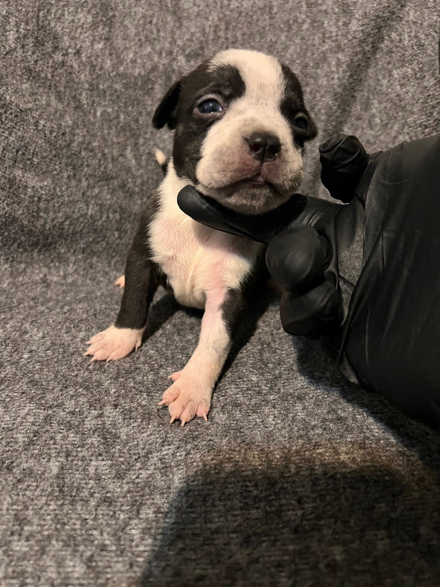 Small in size but big on personality! This adorable bi-color puppy features a classic tuxedo-style black and white coat with a perfectly placed white blaze on the chest and face. With an expressive face and a playful little tongue, this pup is already showing a curious and spirited nature. Its compact, sturdy build and wide-set paws suggest it will grow into a robust and athletic companion. Ideal for someone looking for a spirited, loyal, and incredibly photogenic new best friend.
