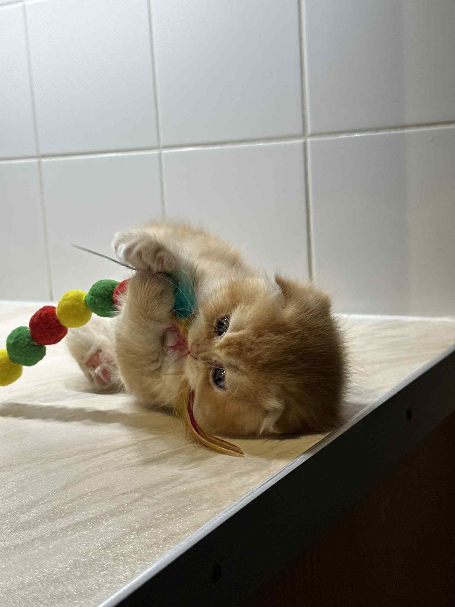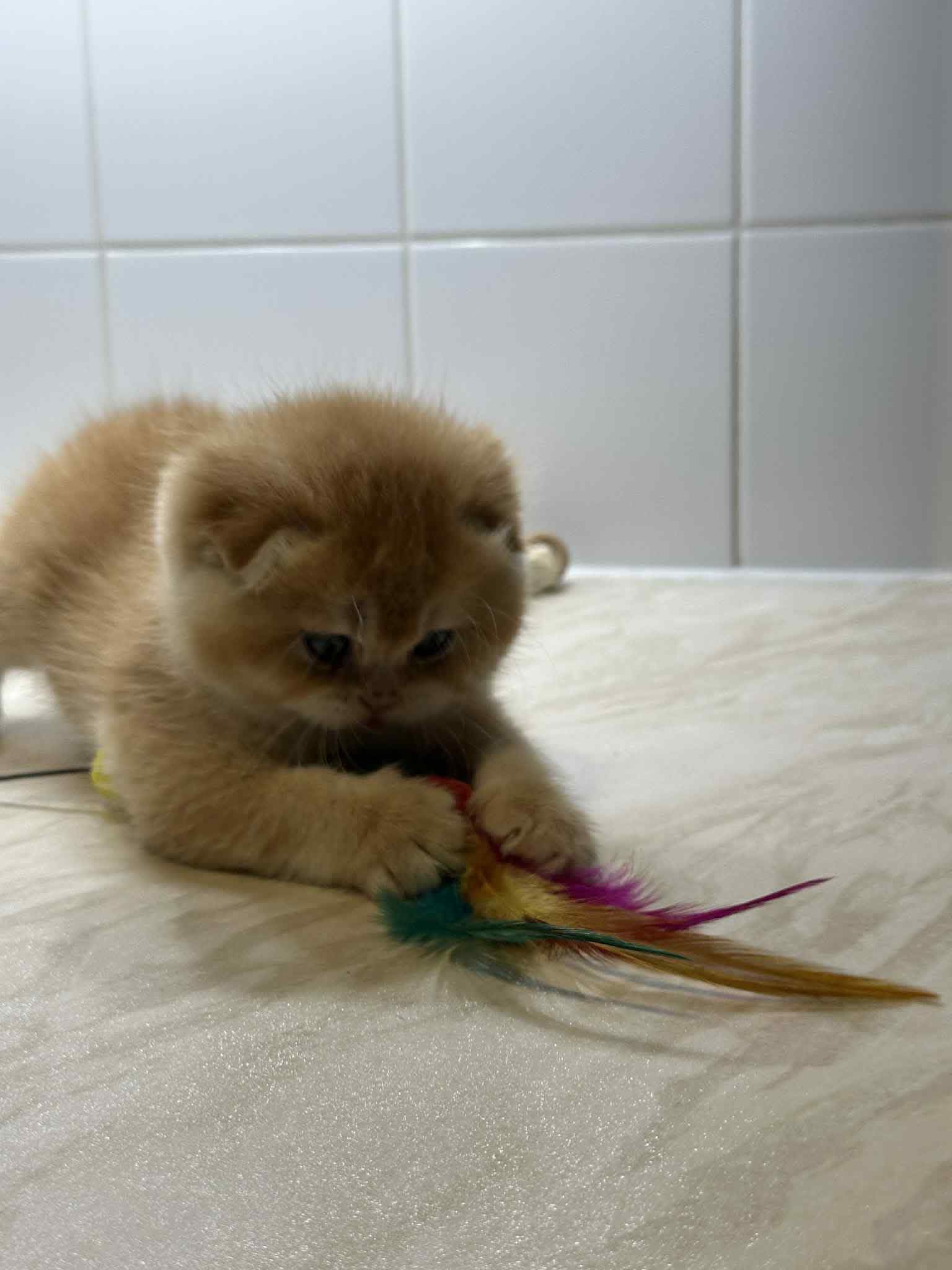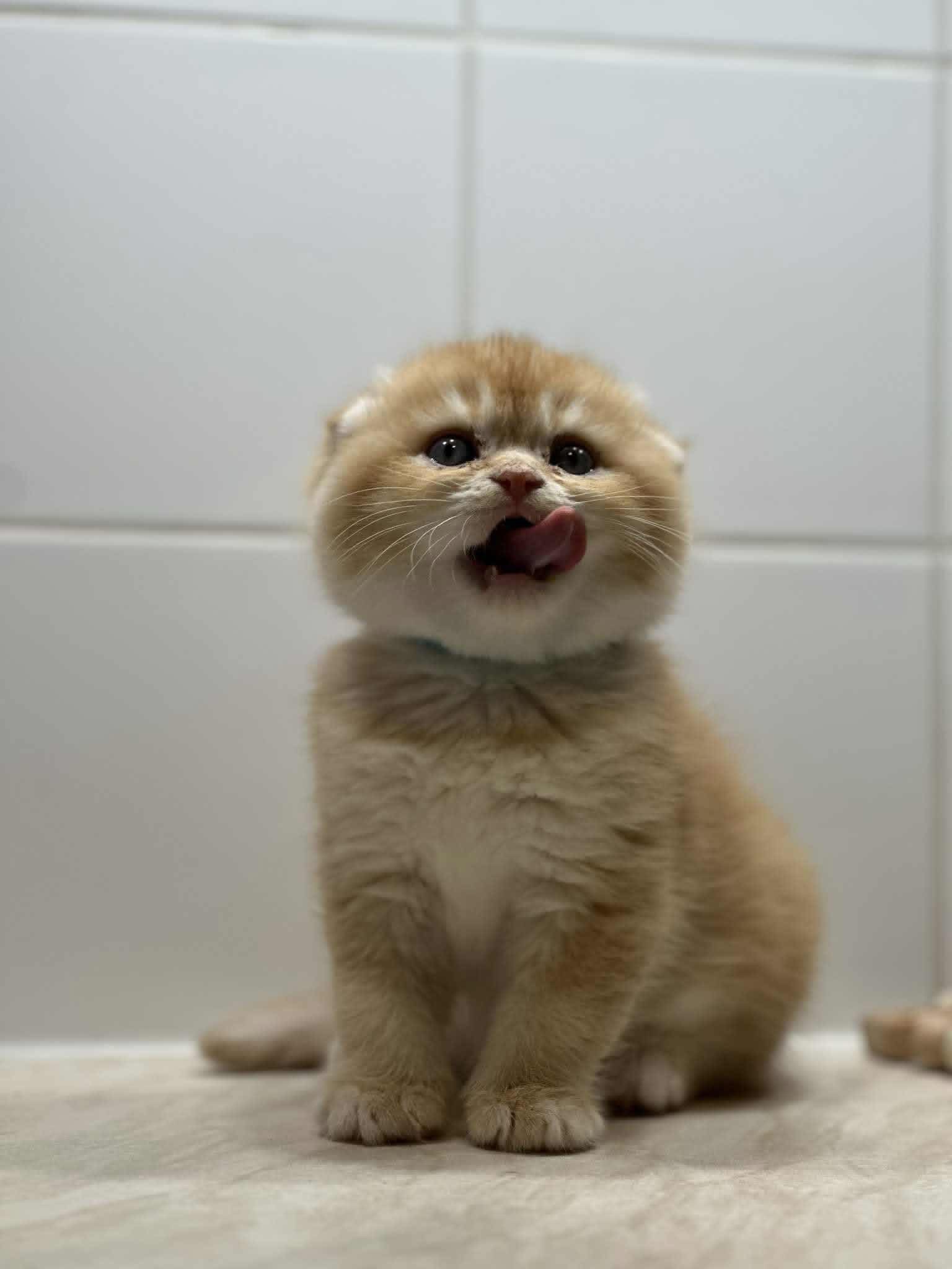 Fall in love with our absolutely adorable Golden Shaded Scottish Fold. With its tiny folded ears and huge, round expressive eyes, this kitten looks like a real-life plush toy. Its coat is a warm, sun-kissed gold that shimmers with every movement.