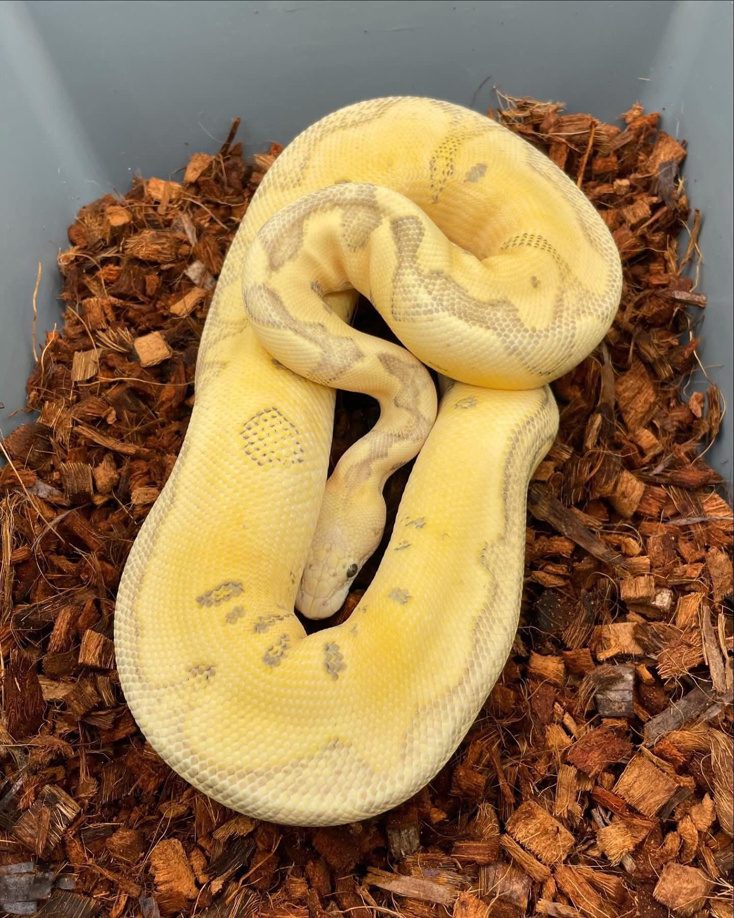 This beautiful Ball Python is a standout example of the Banana morph, known for its unique "fading" pattern and soft pastel aesthetic. This individual displays a clean, reduced pattern with characteristic "freckling" (small dark spots) that develop and increase as the snake matures. Its gentle temperament and stunning, bright coloration make it a perfect "centerpiece" pet for any keeper.